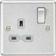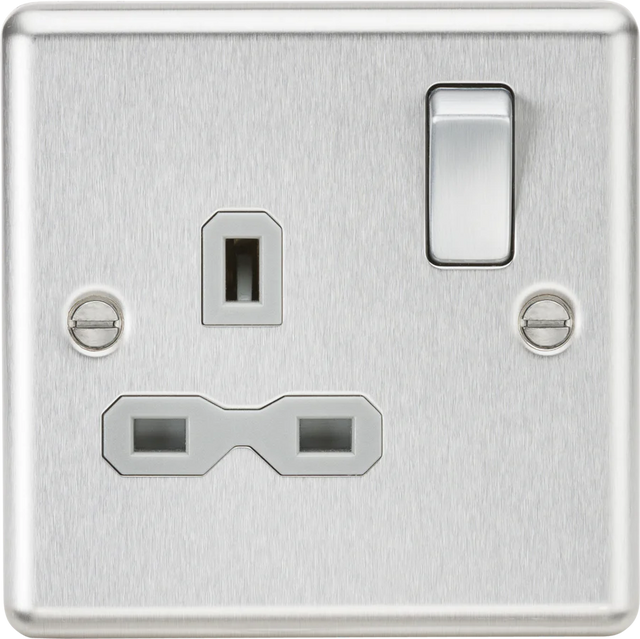Enhance your home décor with the 13A 1G DP Switched Socket in Brushed Chrome with Grey Insert. This contemporary rounded edge socket features a built-in gasket, ensuring a clean look and feel.