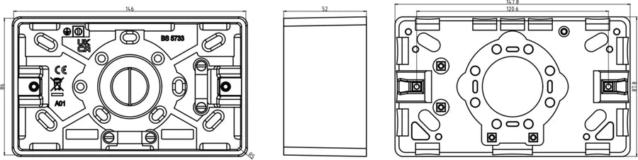 The Knightsbridge Double 47mm Pattress Box is designed for reliable installation within the Knightsbridge Curved Edge (CU) series of wiring accessories.